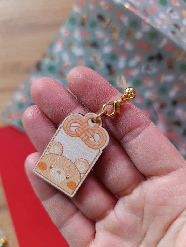 Ein Holzanhänger der den Japanischen Omamori Glücksbringern nachempfunden ist, die man in Schreinen in Japan kaufen kann.