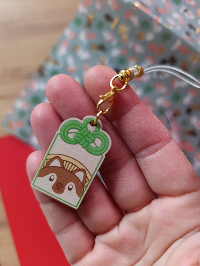 Ein Holzanhänger der den Japanischen Omamori Glücksbringern nachempfunden ist, die man in Schreinen in Japan kaufen kann.